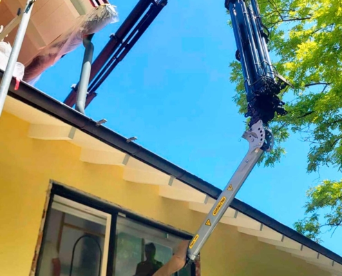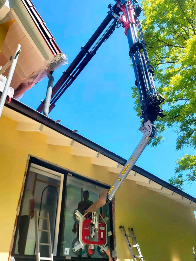 Mit einer großen Ausladung des Ladekrans waren diese sehr hochwertigen und schweren Glasscheiben sicher in das Gebäude einzusetzen.